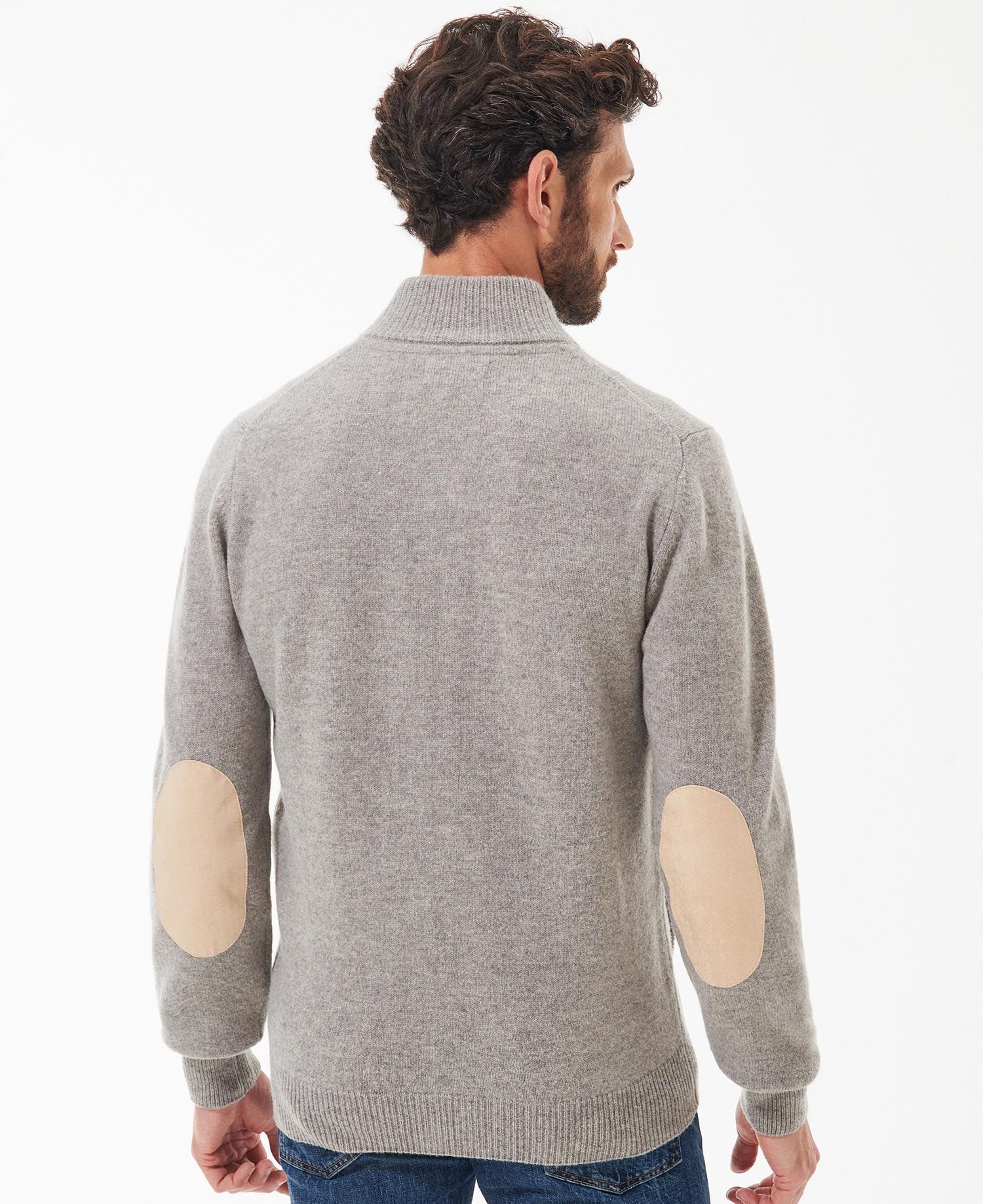 Deze stevige trui is gebreid van pure lamswol en heeft elleboogstukken van alcantara en een kenmerkend borduursel op de borst.